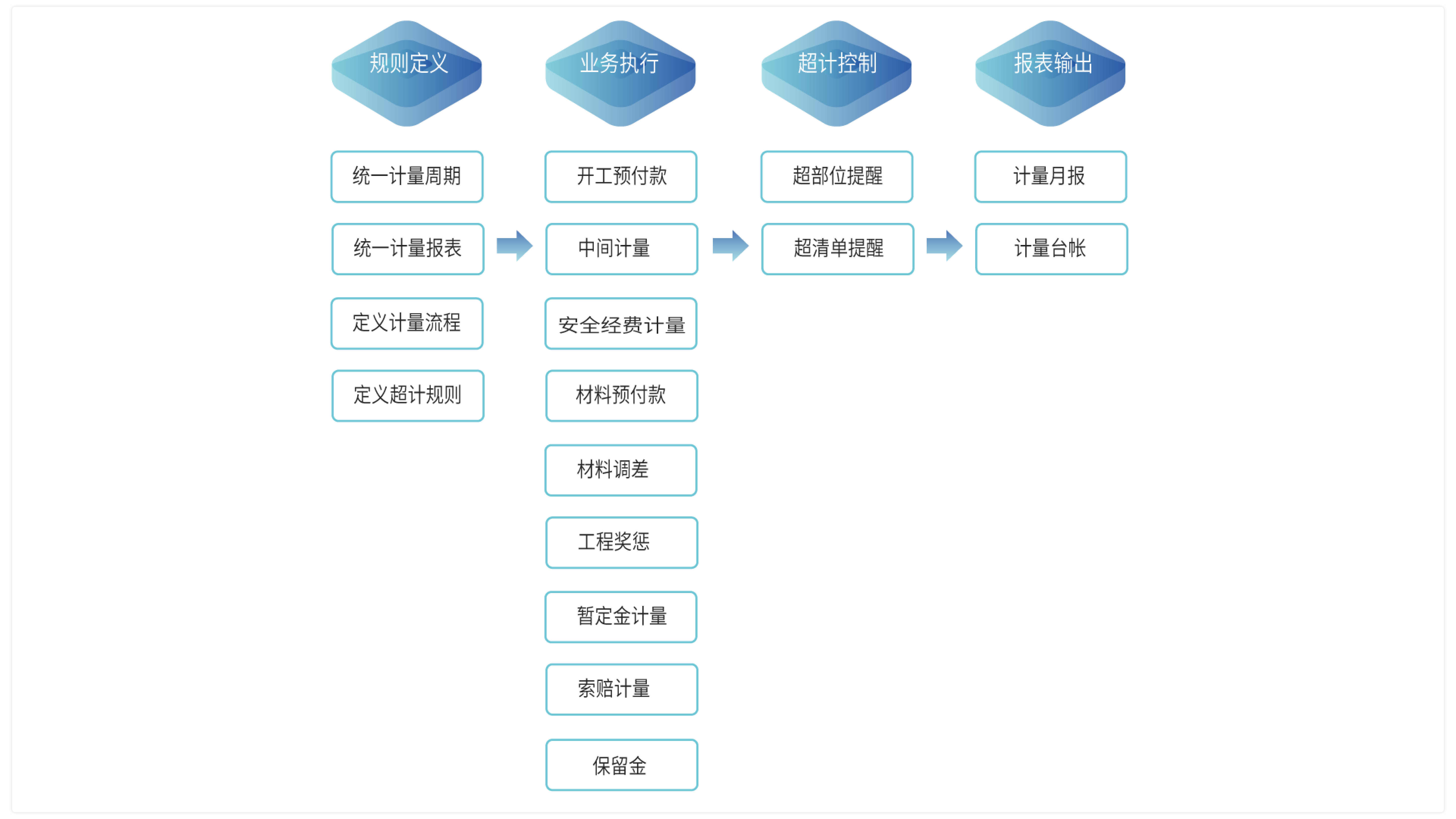 工程計(jì)量多方協(xié)調(diào),流程規(guī)范,程序合規(guī),適用多種承發(fā)包模式下的多種計(jì)量方式,計(jì)量支付全過(guò)程實(shí)時(shí)監(jiān)控,動(dòng)態(tài)透明,程